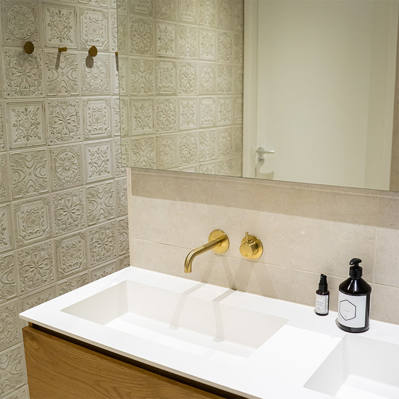 Begin dit jaar werd het nieuwbouwhuis van Ingeborg en haar man opgeleverd en dus moest er een nieuwe badkamer ontworpen worden. “Ik zie veel badkamers met zwarte, witte en grijze accenten, maar dat past niet zo bij ons. In onze badkamer zit geen raam, dus ik wilde graag een lichte en warme sfeer creëren. We wonen vlakbij het strand en dat heeft mij geïnspireerd in het ontwerp. We kozen voor een kleurpalet van zandtinten, blauw en het wit van de wastafels. Door een mix van kleuren en materialen kun je een badkamer verrassend en eigen maken. De zandkleurige tegels op de wand links hebben een reliëf en aan de andere kant zitten glanzende, blauwe tegels. Met die reliëftegels wilde ik persoonlijkheid toevoegen. Dat heeft een nieuwbouwhuis ook wel nodig, alles is nieuw en strak. Geborsteld messing vond ik erg mooi bij het blauw en de zandtinten. Zo ontstond die warme sfeer waar we zo naar op zoek waren. De kranen hebben een PVD-coating, waardoor het oppervlak niet verkleurt zoals bij de Living Colours. De kranen worden erg veel gebruikt in ons gezin, maar door de coating zien ze er na bijna één jaar nog steeds als nieuw uit.”