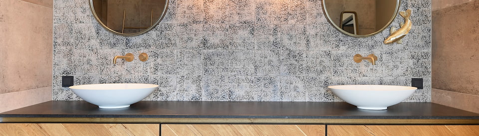 Deze landelijke woning in het Westland is een opvallende verschijning. De rietenkap in combinatie met de moderne entree laten de woning spreken. Klassiek en modern smelten in deze woning prachtig mooi samen. Vanaf de overloop heb je een fraaie uitkijk op zowel de hal als de woonkamer en leidt naar de slaapkamer en het logeervertrek. De riante slaapkamer is in het midden opgedeeld door een kastenwand, waardoor er een ruime badkamer en-suite is ontstaan. Het badkamermeubel is gemaakt van hetzelfde hout als de vloer, wat zorgt voor een mooie eenheid. De waskommen staan op een keramiek blad. Voor de achterwand is gekozen voor een kleine tegel met een gestempeld patroon, waarbij de inbouw wastafelkranen in geborsteld messing (CB005) en de gouden vissen het geheel een eigen karakter geven. Het vrijstaande bad inclusief vrijstaande badmengkraan (CB077) in geborsteld messing voor het grote raam zorgt voor een ruimtelijk effect.